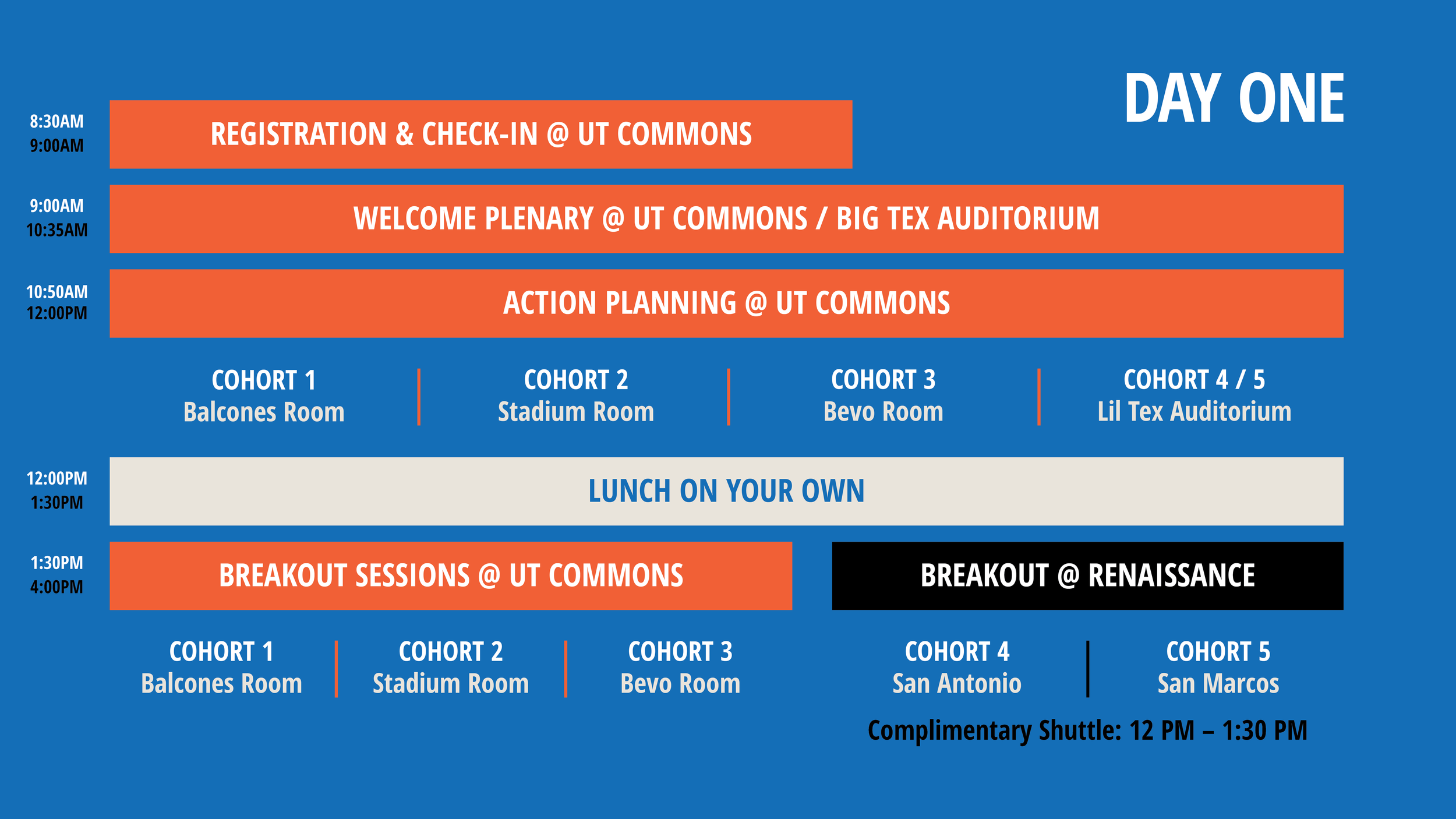 Each LEA/District has been assigned to a cohort - you can check to see your cohort assignment here. Cohorts 1-3 will be at the UT Commons Conference Center all three days; Cohorts 4-5 will start at the UT Commons Conference Center on Monday morning, and then move to the Renaissance Hotel for Monday afternoon and all of Tuesday and Wednesday. We are offering a complimentary shuttle from 12:00-1:30 on Monday to help with the transfer from the Commons to the Renaissance.